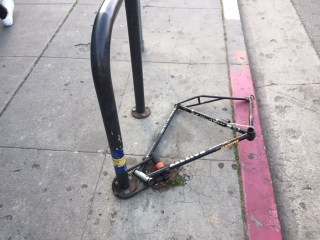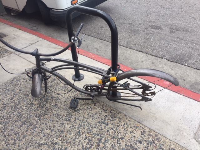 2. Another bicycle chained to a street rack. This was a less desirable bike, apparently, because the thieves had taken only the wheels and tires.