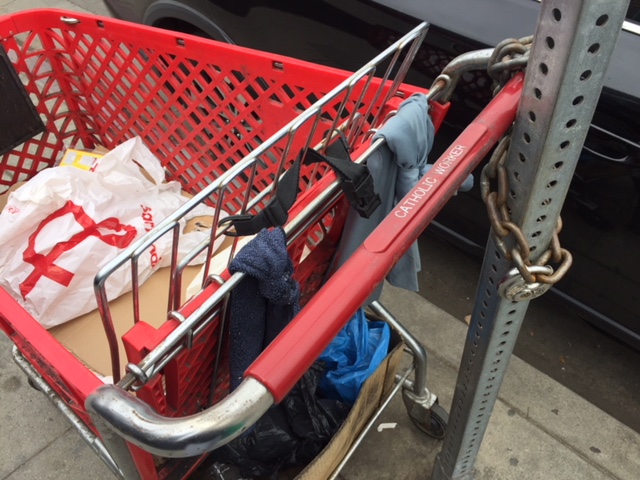 A few blocks on, I passed this. I believe a homeless person had liberated a shopping cart and chained it to another traffic sign post in order to keep someone else from taking it. (Other local denizens convey their goods in baby strollers, which I do not think are purchased at the Caro Bambino store on Main Street.)